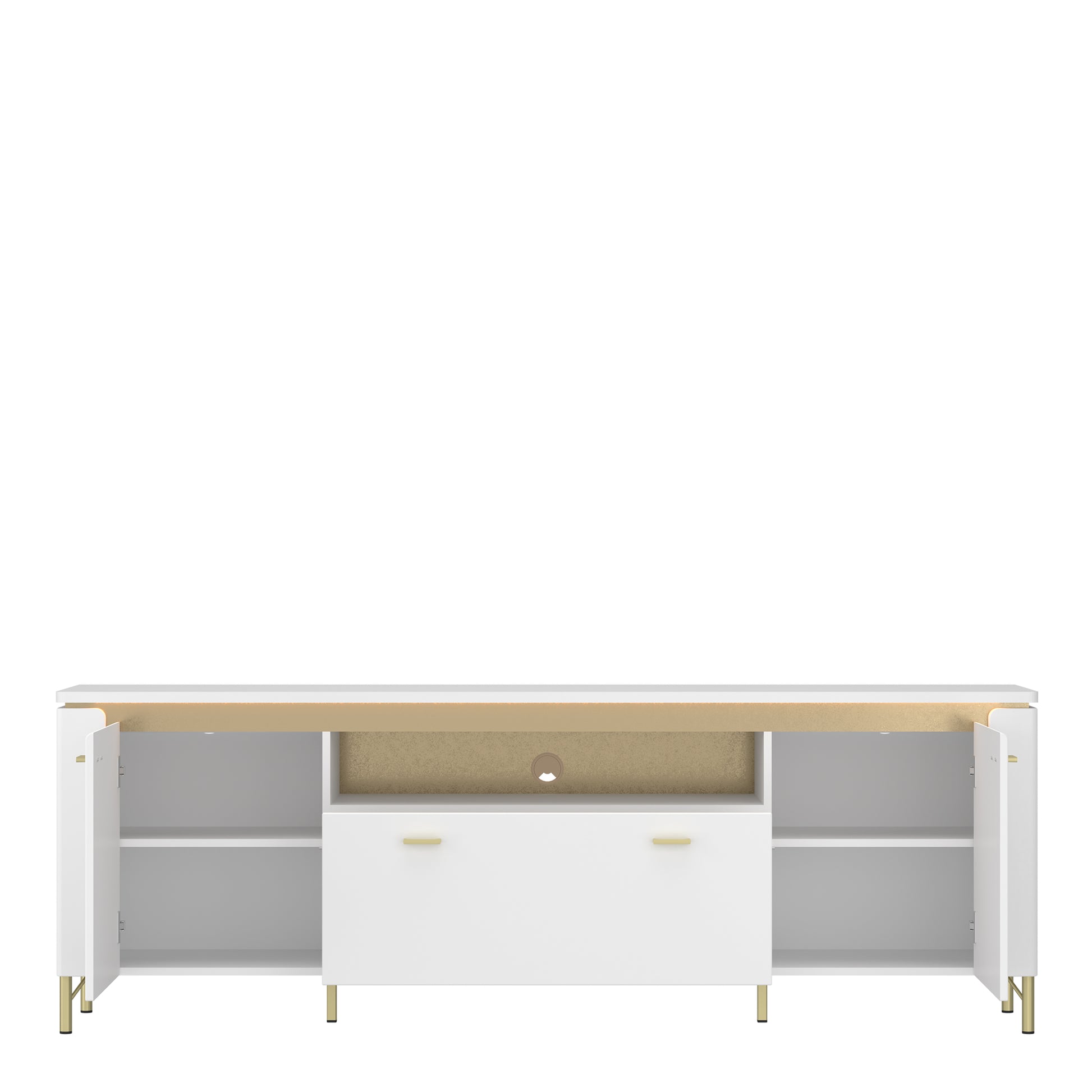 Elevate your living area with the Lazio TV Cabinet in Alpine White and Gloss White. This modern piece features two doors, one drawer, and LED lighting for a touch of luxury. Crafted from MDF and laminated chipboard, it blends sleek white with gold accents and high metal legs. The cabinet includes soft-close doors, a spacious drawer with ball-bearing guides, and an open shelf.