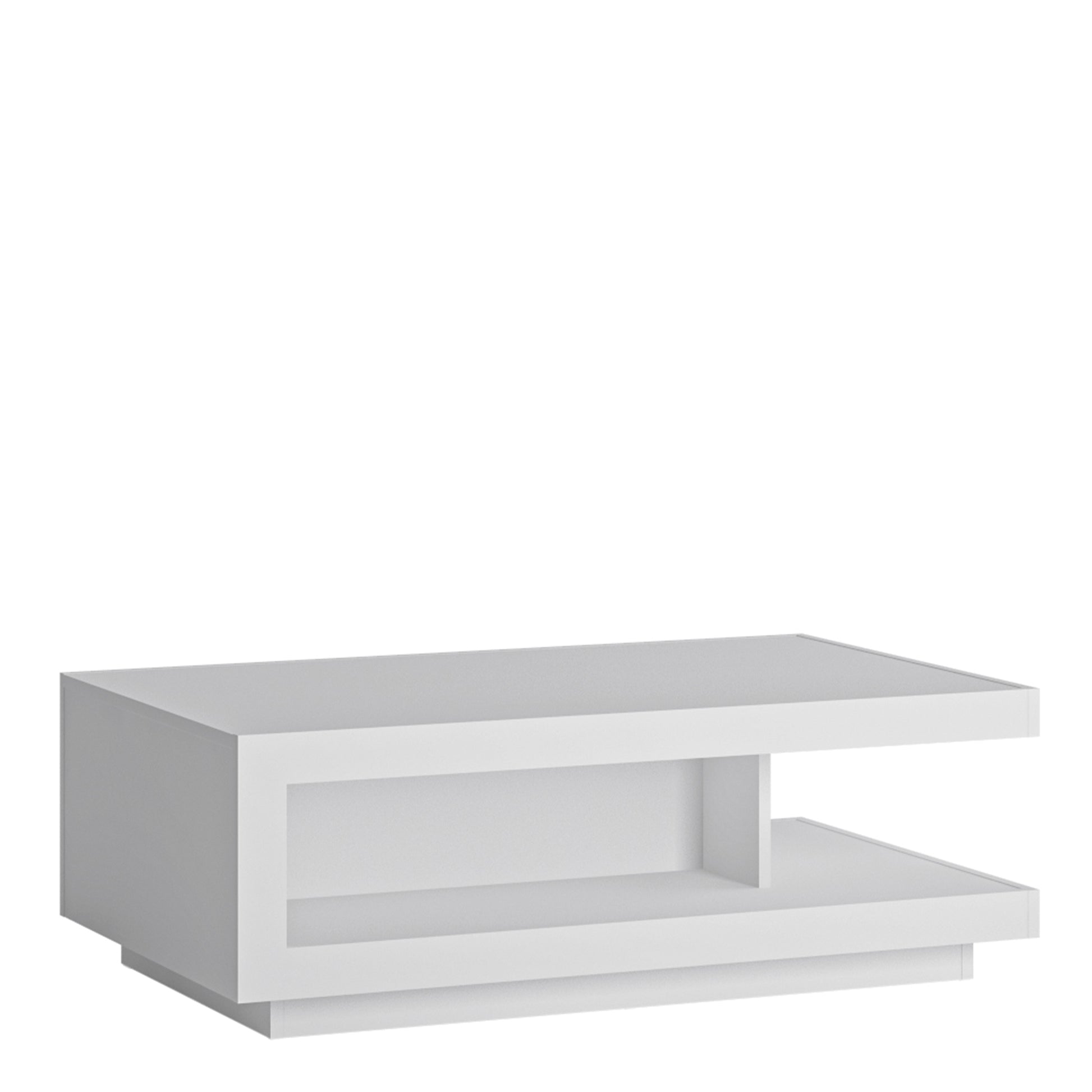 Designer coffee table in Riviera Oak/White High Gloss. Fantastic geometric designed coffee table, storage all round on shelving. A high quality collection in a ultra modern design - with each item complementing each other.