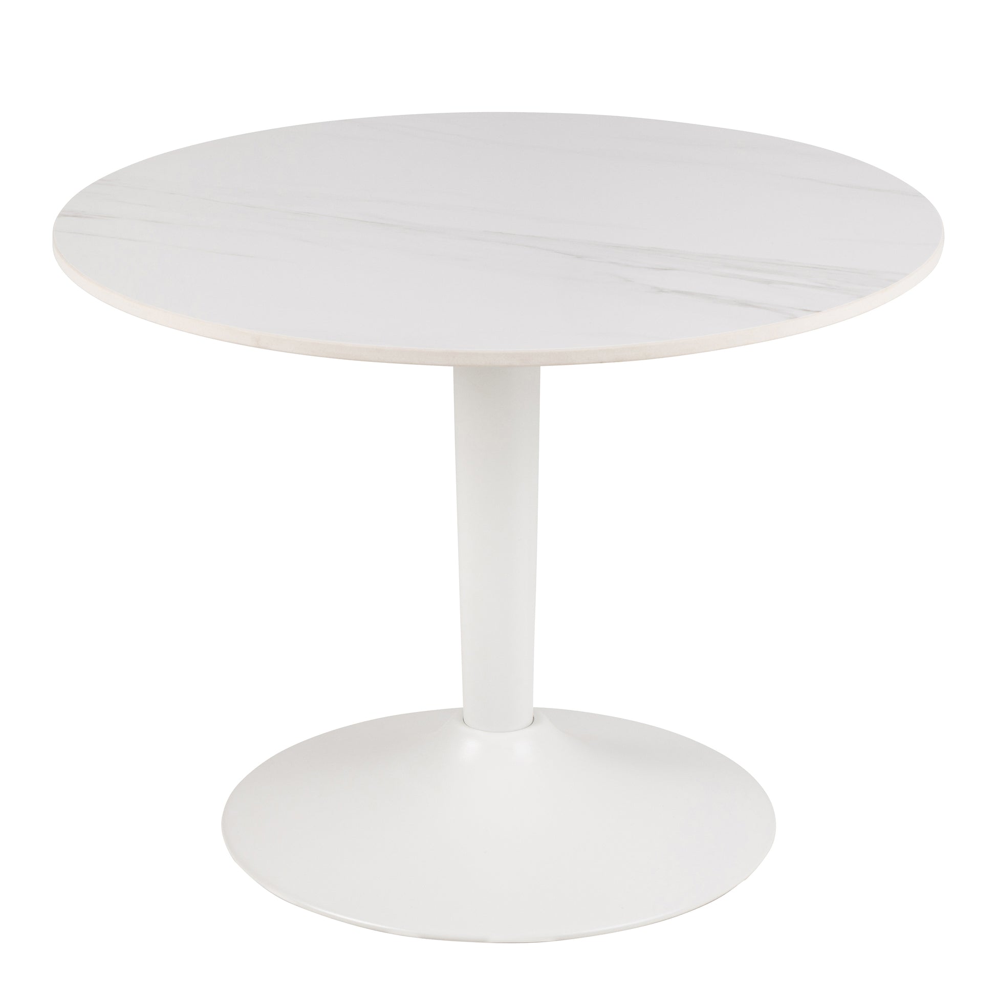 - Round coffee table with mid-century modern vibes, Practical tabletop in white marble look , Heat and scratch resistant ceramic surface, Trumpet base made of matt white powder-coated metal, Easy to assemble,