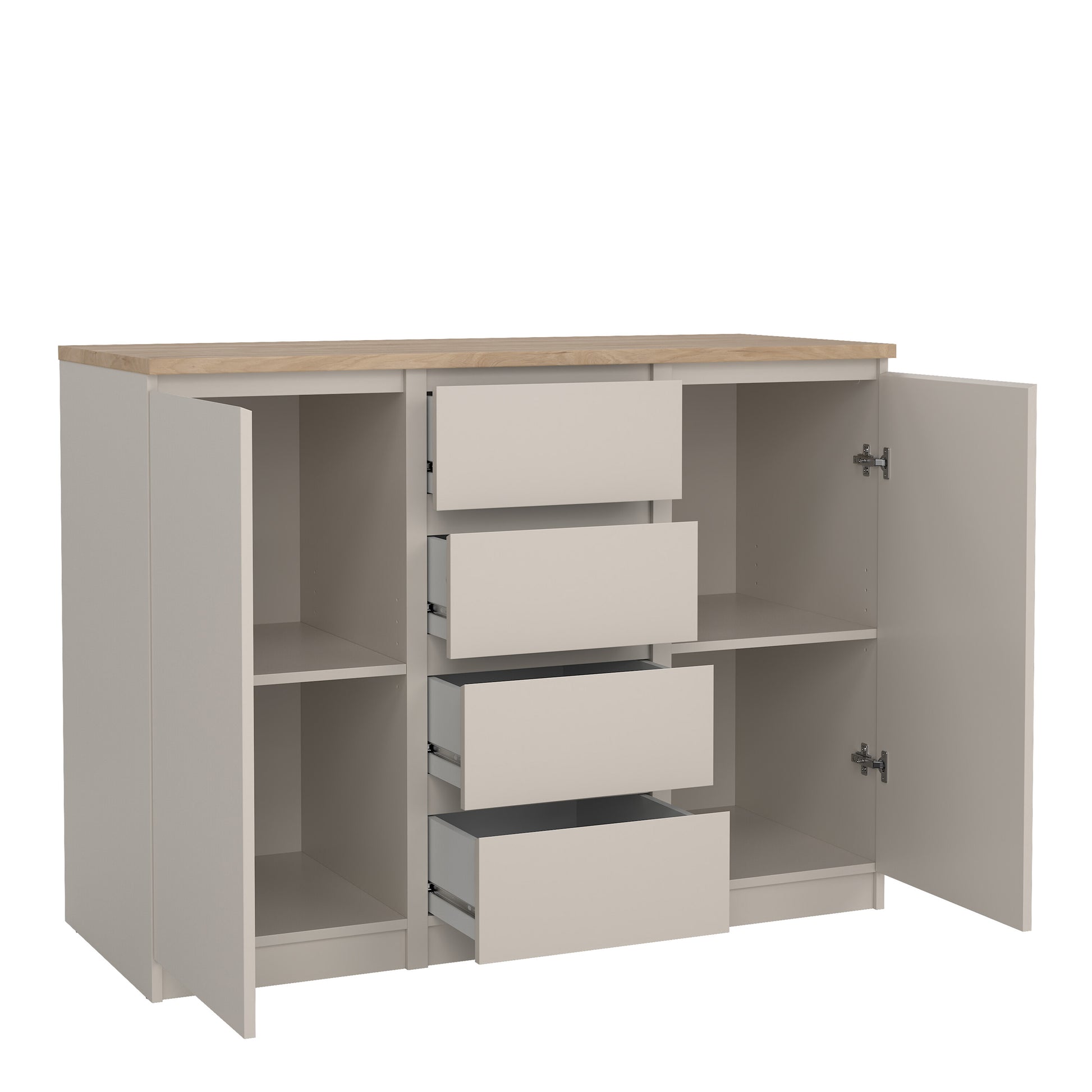 - Designed with thought and care, it features two symmetrical doors hiding adjustable shelves, great for storing bulkier items. In the center, there are 4 smooth-gliding drawers, built with premium steel mechanisms for a quiet, effortless experience that reflects the sideboard’s high-quality craftsmanship., The handleless design keeps things sleek and modern, with a simple press-to-open system that adds a touch of understated luxury. The Jackson Hickory oak top brings in a natural, organic feel that softens the overall look. It’s a great spot for displaying your favourite things-framed pictures, plants, or even a stack of books to show off your personal style., Paired with neutral walls and light wood flooring, the sideboard’s soft cashmere tone complements a calm, relaxing colour palette. The mix of smooth finishes and natural wood grain adds just enough texture to keep things interesting without losing the serene vibe., Whether it’s for your bedroom, dining area, or living space, the Naia Sideboard is versatile enough to suit any room. Its timeless design means it’ll effortlessly fit in as your style evolves-a smart investment that pairs beauty with function., ,