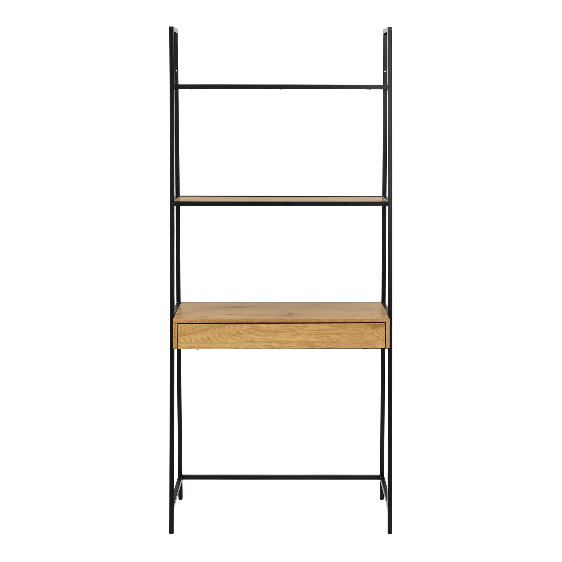 Our bookcase offers a smart design with a matt black steel frame and base, featuring a drawer and two shelves in matt wild oak effect. It includes metal runners for smooth functionality and an office desk top for added convenience, perfect for enhancing productivity in any home or office setting.