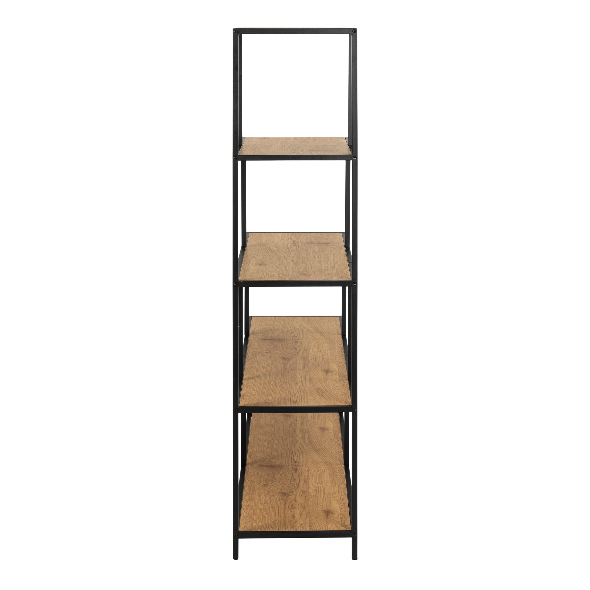 Our bookcase stands out with its matt black steel frame and base, offering four shelves with a matt wild oak effect with an asymmetrical and step-shaped design. It's a modern piece that provides both visual interest and functional storage, ideal for contemporary spaces.