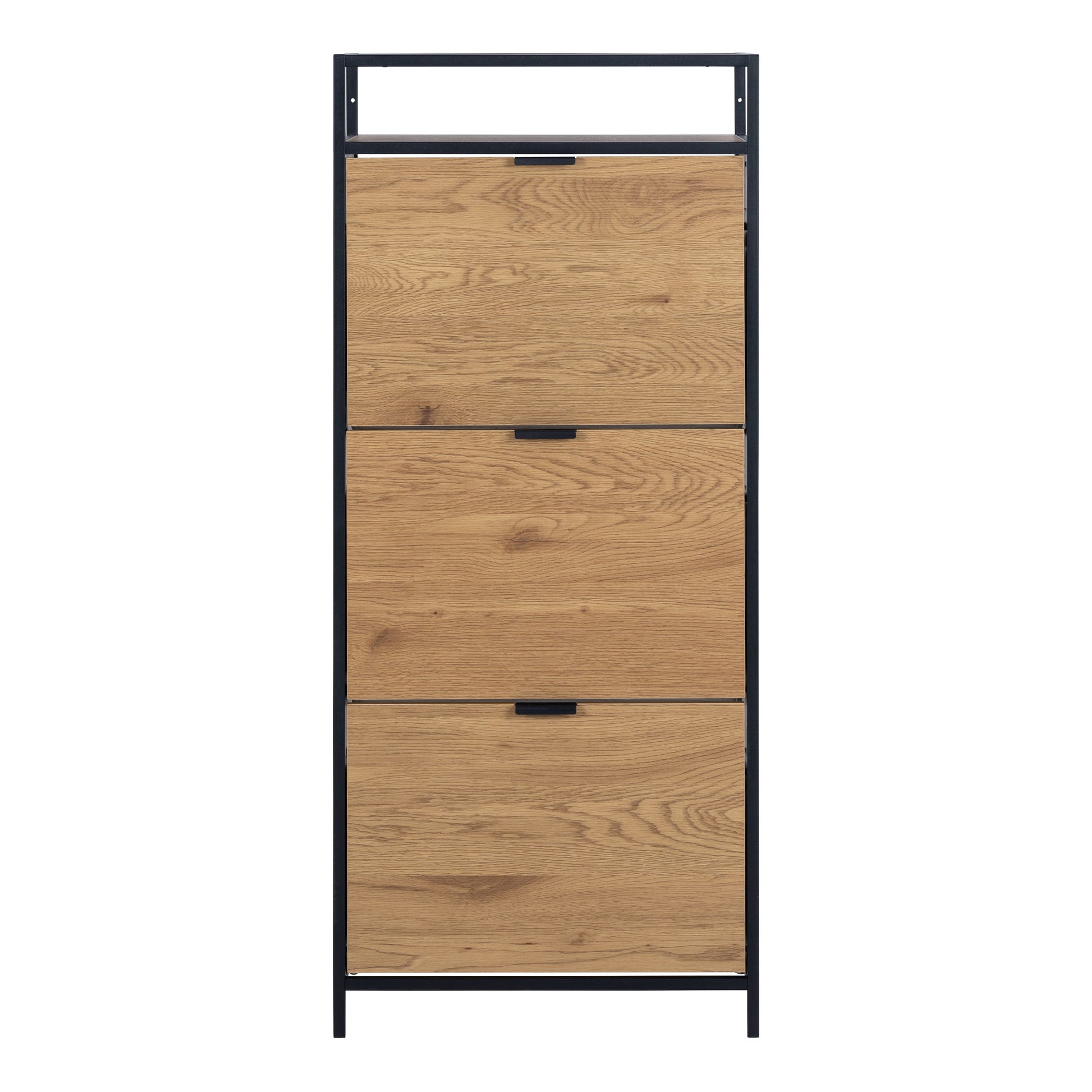 Introduce a sleek storage solution to your home with this shoe cabinet, featuring a matte black steel frame and base. It includes three drawers with a matte wild oak effect finish and an open compartment, combining functionality with contemporary design.