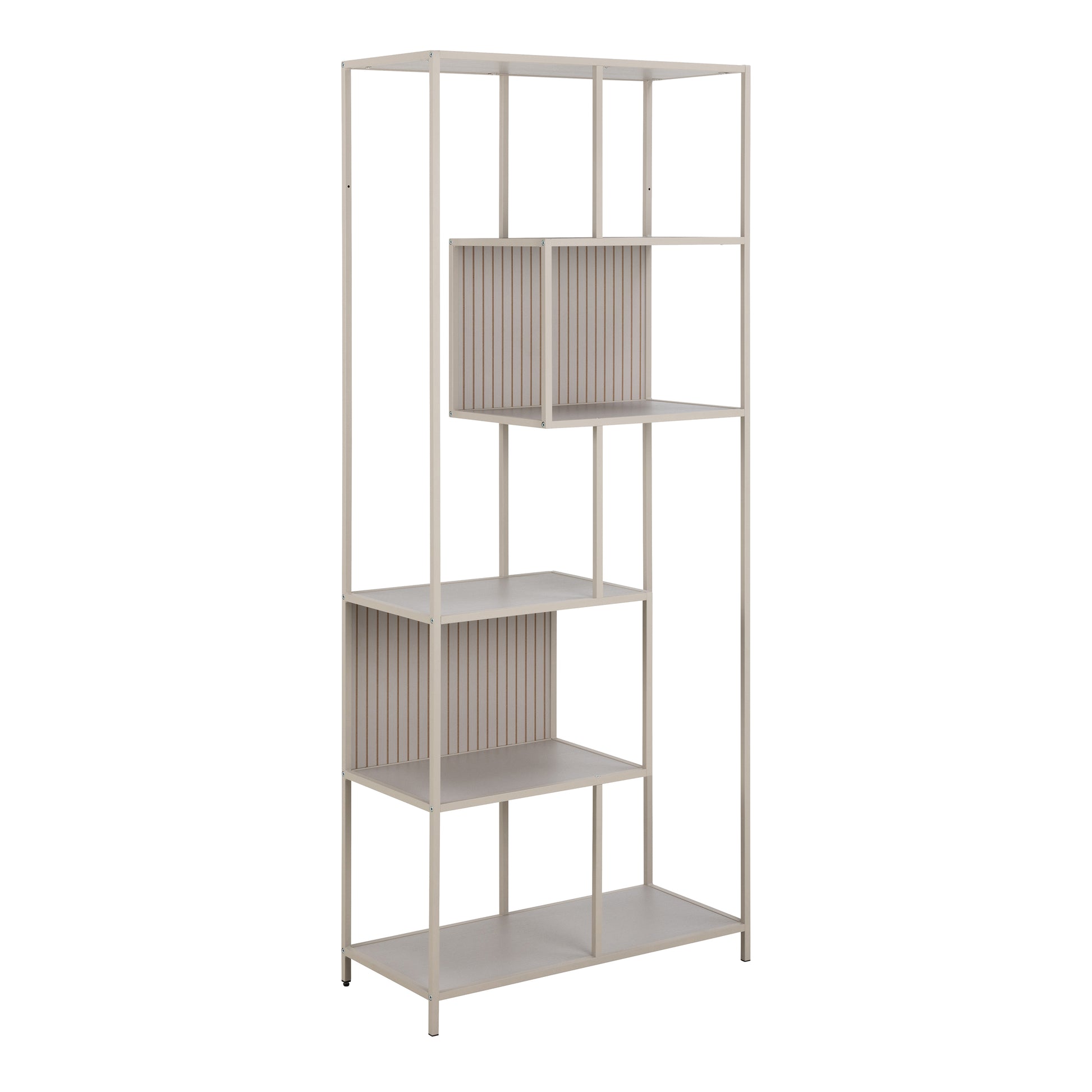 - Frame made of grey powder coated steel, Features 5 grey shelves, 2 slatted elements, and an asymmetrical detail, Made of easy care materials, Designed by Nissens Tegnestue, FSC™ certified,