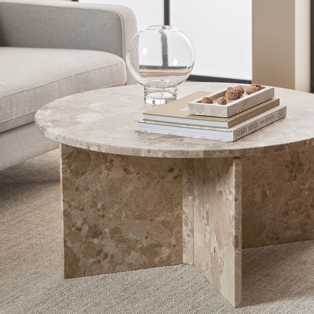 - Sculptural coffee table brings sophistication to the living room, Round tabletop and V-shaped base , Made of latte brown marble , Stone naturally varies in colour, structure and surface making each piece unique, Designed by our in-house designer Lasse Cha Pedersen,